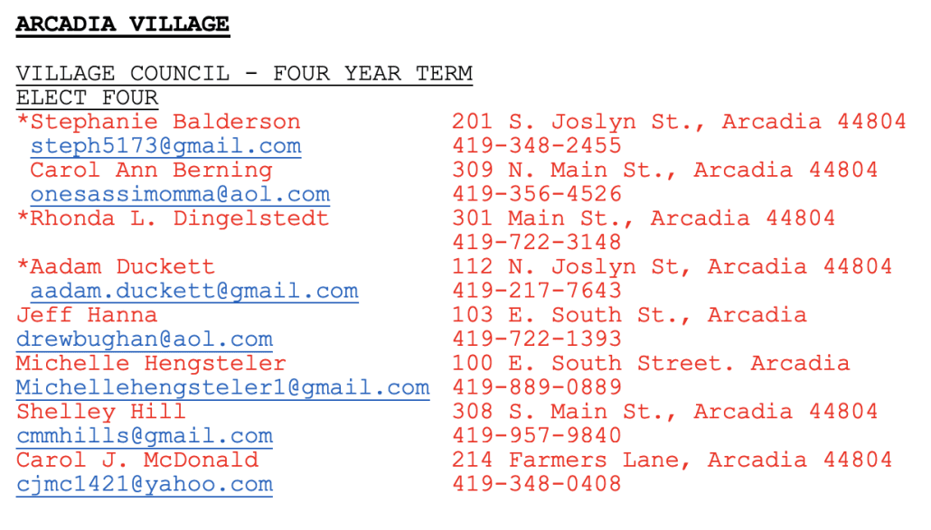 ELECTION 2025 – Candidates for Arcadia, OH City Council