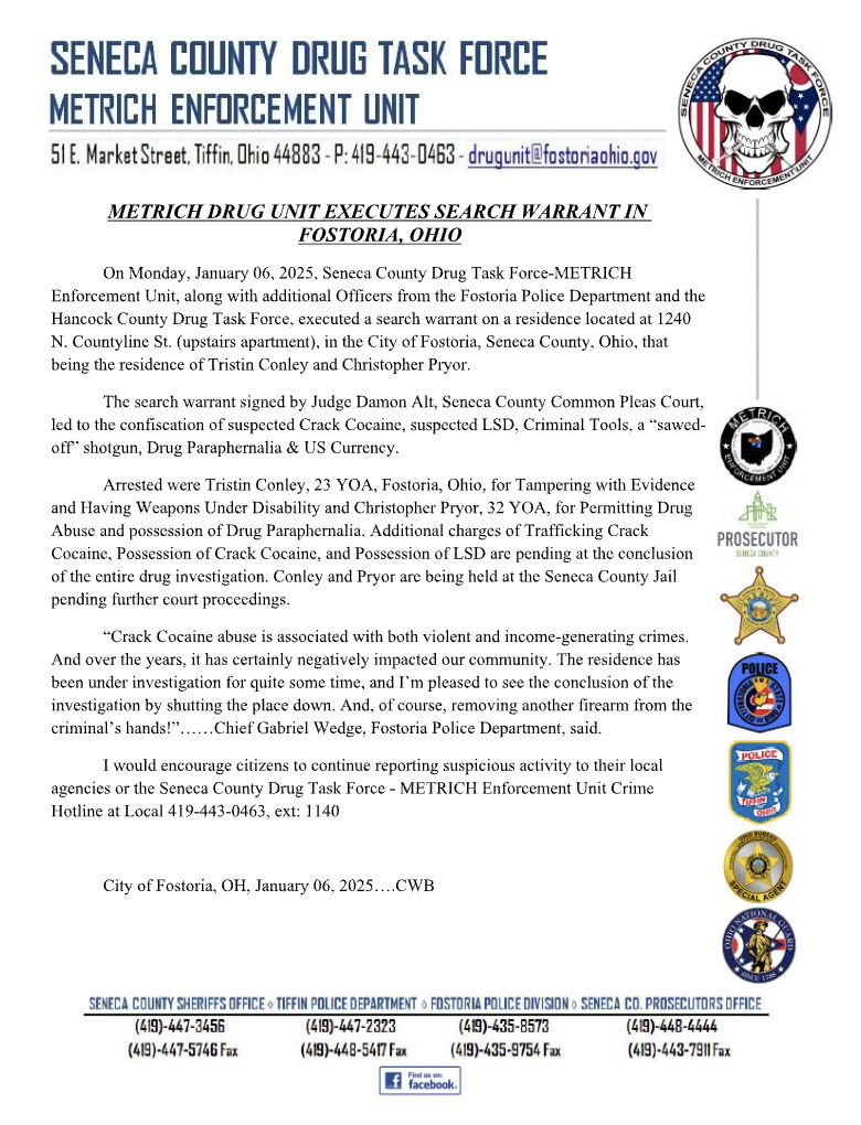 On January 6, 2025, the Seneca County Drug Task Force-METRICH, with assistance from the Fostoria Police Department and the Hancock County Drug Task Force, executed a search warrant at 1240 N. Countyline St. in Fostoria.