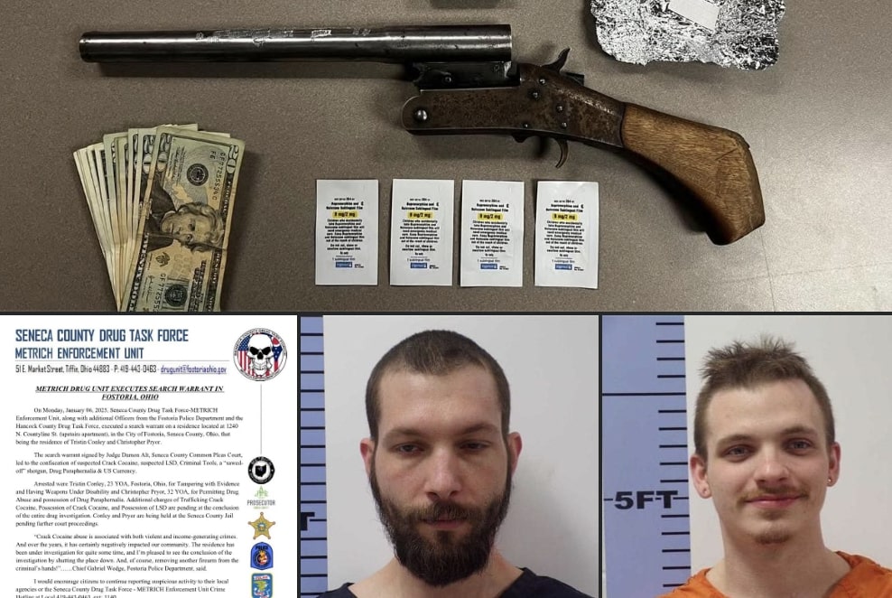 As a result, suspected crack cocaine, LSD, drug paraphernalia, and a sawed-off shotgun were seized. Two individuals, Tristin Conley (23) and Christopher Pryor (32), were arrested and are currently being held in the Seneca County Jail, with additional charges pending.