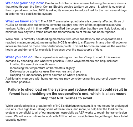 ATTICA, OH | North Central Electric (NCE) is calling on its members to reduce electricity usage following a severe storm on June 18, 2025, that caused an AEP transmission issue affecting the cooperative’s service territory. The failure, outside NCE’s control, has impacted three of its 12 distribution substations, covering about one-third of the area. AEP has estimated a minimum two-day repair timeline as of 4:53 PM CDT today, June 19, 2025.